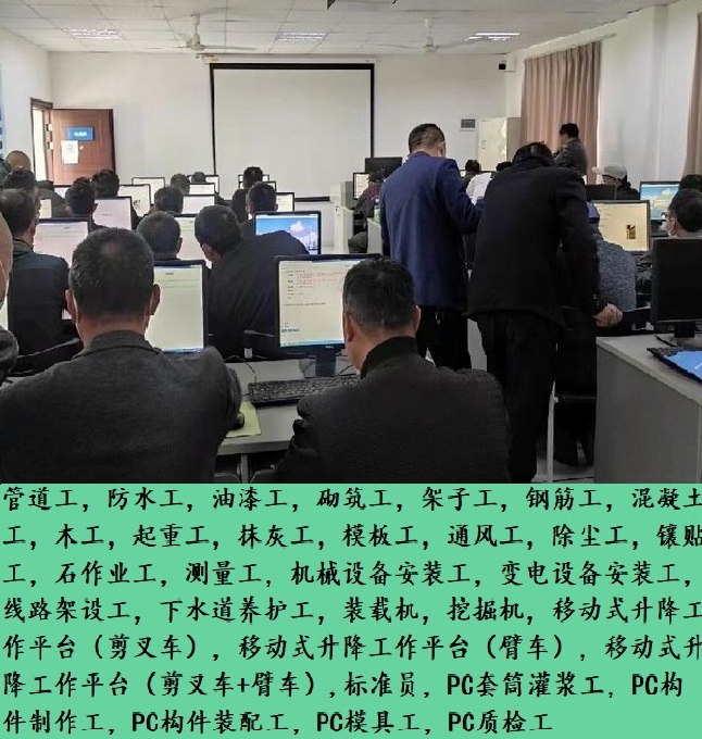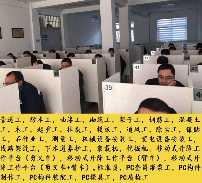 常年开设:防水工,管道工,油漆工,砌筑工,钢筋工,混凝土工,木工,起重工,抹灰工,模板工,通风工,除尘工,镶贴工,石作业工,测量工,机械设备安装工,变电设备安装工,线路架设工,砧细工,砧刻工,彩绘工,匾额工,推光漆工,砌花街工,泥塑工,下水道养护工